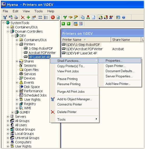 Wie auf der Abbildung unten dargestellt, kann Hyena alle Drucker im Netzwerk anzeigen. Sogar nicht freigegebene, an jedem Computer oder Server. Hyena´s Druckermanagement bietet folgende Funktionen: